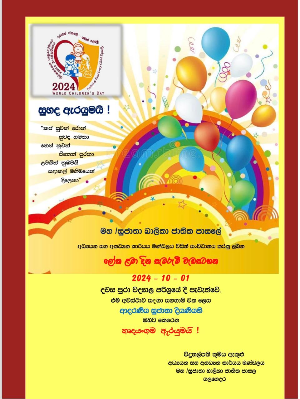 සුජාතා දියණියක් නැණ ගුණයෙන් පිරිපුන්ව දැයට අගනා මෙහෙවරක් ඉටු කරන අභිමානවත් පිරිසක් බවට පත් කිරීමට ඇප කැප වෙමු.